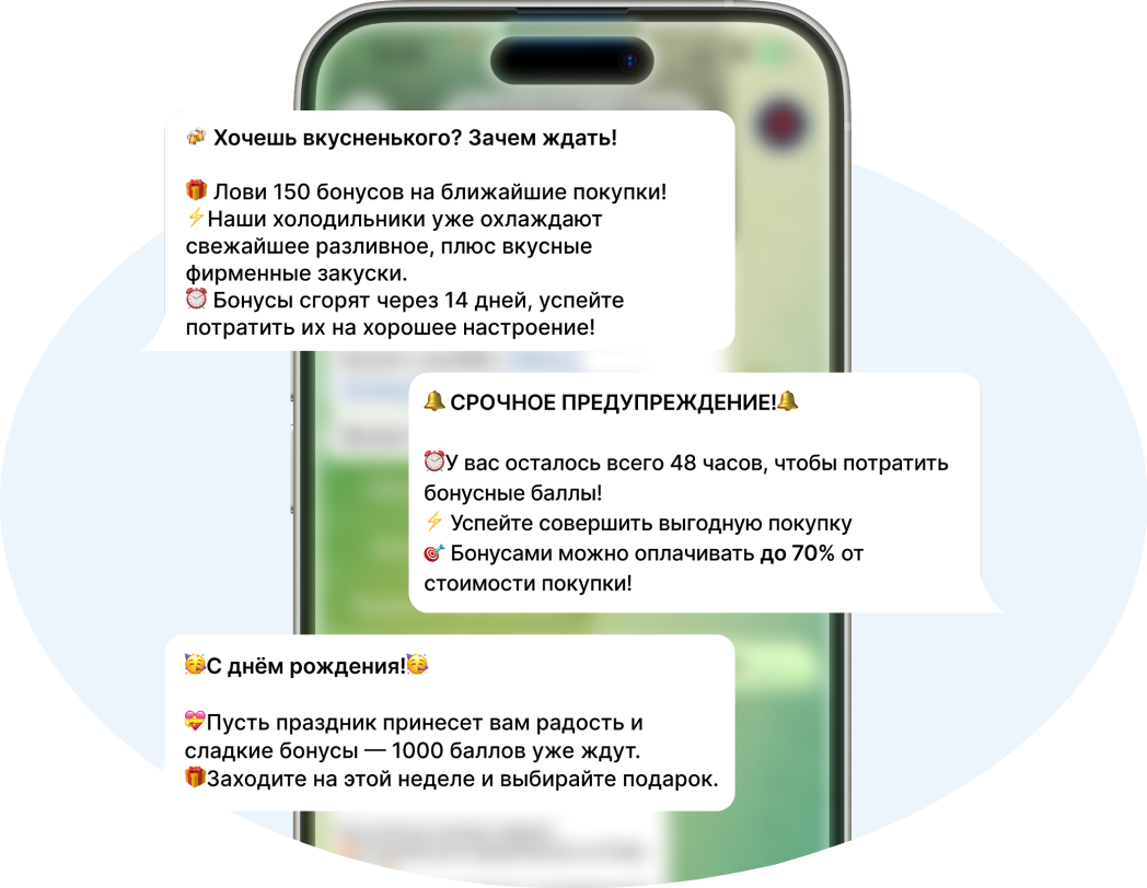 Сообщайте клиентам новости, приглашайте за покупками, рассказывайте об акциях и уведомляйте о сгорании бонусов.