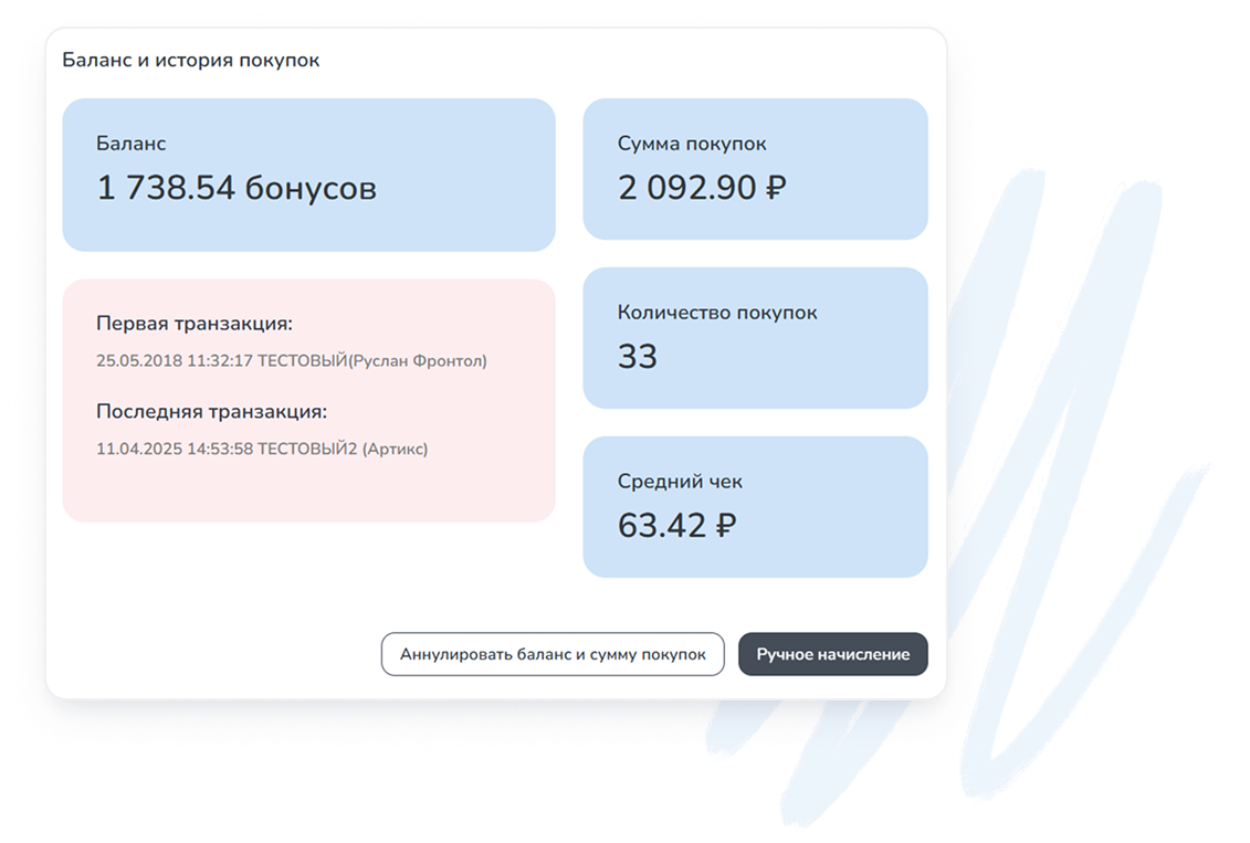 | % бонуса или скидки, баланс бонусов и уровень в программе лояльности в реальном времени | ✔️ | ✔️ | ✔️ |